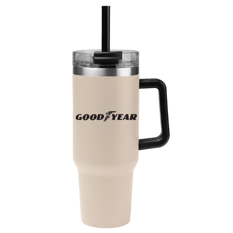 The 40 Oz. Intrepid Stainless Steel Tumbler features a double-wall construction for insulation of hot or cold liquids, keeping drinks cold for up to 24 hours and hot for up to 8 hours. It includes a screw-on, spill-resistant lid with a straw hole and a 12" straw. The tumbler is BPA-free, has a powder-coated finish, and comes with a handle. Recommended for hand washing. Branded with the Goodyear Corporate Logo. Product color: Beige.